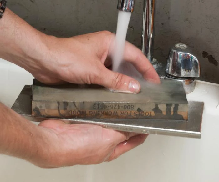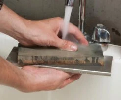 To flatten a water stone, just draw a grid on the surface of the stone, and rub it against the Dia-Flat under running water, or in a shallow tub or pan. Use the whole surface of the plate, and moderate pressure. The stone is flat when the grid lines have been worn away.