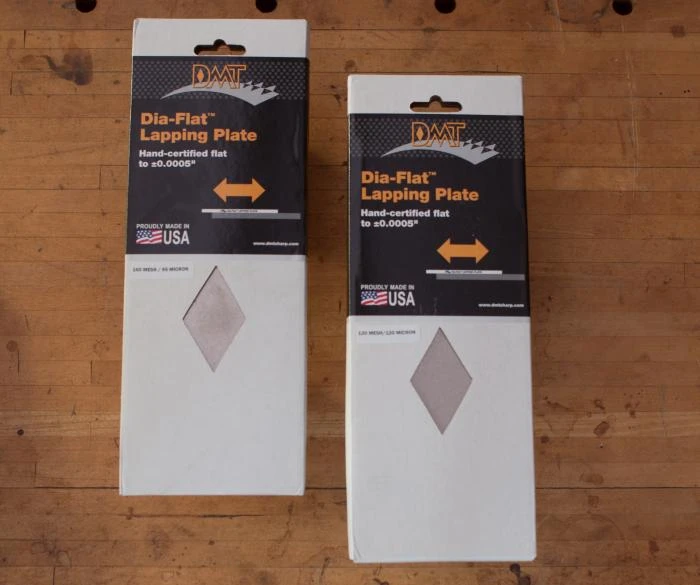 Dia-Flat Lapping plates are available with 120 or 95 micron diamond abrasive. 120 Micron Dia-Flat is our favorite for flattening sharpening stones, and heavy material removal to repair edges. If you will be using your Dia-Flat primarily for flattening the backs of tools, the 95 Micron plate is a better option as it leaves a smoother scratch pattern that is more easily polished out during sharpening. Likewise, if you prefer a smoother surface on high grit water stones the 95 micron plate is the way to go.