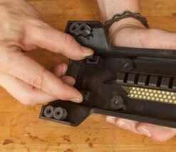 The regular DMT DuoBase holds all DMT 10″ and 8″ DuoSharp and DuoSharp Plus bench stones, and has a recess that will fit (but not clip) 2″ x 6″ Diamond Whetstones. To place a stone on the base, just snap the tabbed stops over the ends of the stone. The base can be used on a work surface, or held with the built in handle to bring the stone to the work-piece for sharpening large or heavy tools like drawknives or axes.