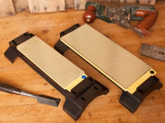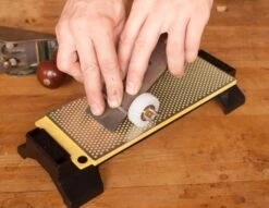 DuoSharp Plus stones add a 3/4″ wide uninterrupted surface to the ends of what would otherwise be a classic 8″ DuoSharp bench stone. The uninterrupted surface is for sharpening pointy, or narrow tools. Like the regular DuoSharp, these stones are light weight, and travel well. If you regularly sharpen chisels, knives and plane irons, but only occasionally need to sharpen tools narrower than 1/4″ the DuoSharp is good option.