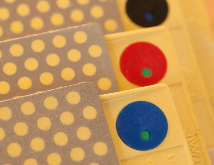 Duosharp Stones are the classic patented DMT Polka-Dot Sharpening stones. Stones are two sided, and have an interrupted steel surface on both sides. The recessed dots keep abraded metal dust off the abrasive surface of the diamonds, for very fast sharpening. The dots will catch tools much smaller than 1/4″ or anything with a curved surface like a gouge – but their compact construction, light weight, and two-grit configuration make them an excellent choice for many users.