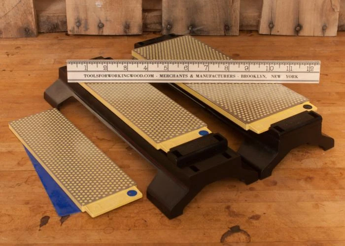 10″ by 4″ stones have a luxuriously large surface covered in over 4 Carats of diamond abrasive for even the widest plane irons or knives. The large size makes the 10″ stones a natural choice for use with sharpening jigs. The diamond surface measures 9 7/8″ by 3 15/16″