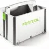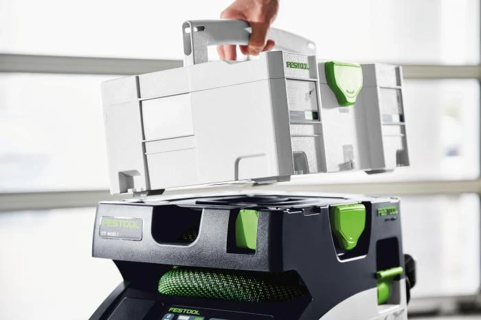 The Midi has 130 CFM of suction and a 3.9 gallon container capacity. The vac is fully integrated with Festool’s stackable Systainer system. The vac’s anti-static braided sleeve hose measures 11 ½ ft.