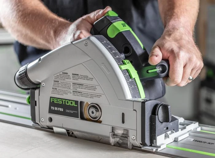 There are so many reasons to love the TS 55. The splinter guard means cuts that are virtually splinter-free on both sides. The cutting edge from 90?° to 47?° remains unchanged even when the saw bevels. You’ll get angle adjustment with undercut function from -1?° to 47?°. The riving knife descends with the blade as the cut is made, keeping the freshly sawn kerf from closing up, which in turn keeps the wood from pinching the blade and burning. The knife is spring-loaded, so it doesn’t get into the way of plunge cuts. The riving knife emerges from the saw body before the blade for easier positioning in existing saw cuts. A true plunge cutter, the TS 55 plunges to depth easily and safely, without any tricky balancing act. The variable speed, electronically controlled motor gives constant speed under load and protects the saw from overheating. And the FastFix saw blade changing system locks out the motor and freezes the arbor for easy, quick, and safe blade changing.