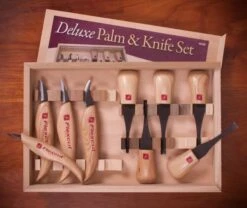 Comprised of 4 carving Knives and 5 Palm tools packaged in a wooden box. It has a good range of Knives to cover roughing, and detail.