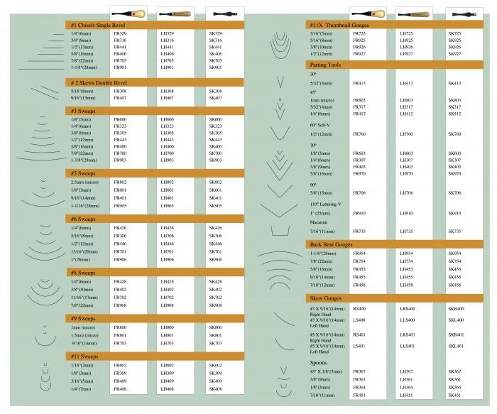 #2 x 5/16″ Skew, #3 x 3/8″ Gouge, #3 x 5/8″ Gouge, #5 x 9/16″ Gouge, #6 x 5/16″ Gouge, #8 x 3/8″ Gouge, #11 x 1/8″ Gouge, 70 deg. x 1/4″ V-Tool, 70 deg. x 3/8″ V-Tool.