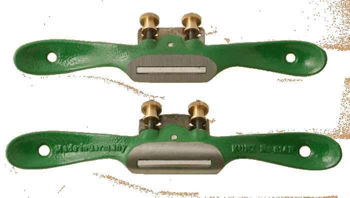 These are the general all around workhorse spokeshaves. One version has a flat sole and the other is curved from front to back. Two adjustment screws make it easy to set the depth of cut. Made in Germany by Kunz.