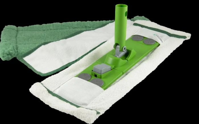 The most striking mop head is an exceptionally plush green fleece mop that grabs and keeps dust and dirt. Use this mop for your daily dusting. The white micro-mop plush is intended for damp mopping with Osmo Wash & Care cleaner. And the Active Fiber cloth is designed for refreshing floors with Osmo Liquid Wax Cleaner or Liquid Wax Refresher.