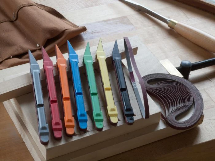 All the belts and holders are color coded to make it easy to select the grit you want. Two kits are available – the standard kit – with belts rough enough to remove material. This is a great kit for carvers who want to do their final sculpting with abrasives. The second kit is the finishing kit, with finer grits up to 500 for final surface treatment. Replacement belts are available and are interchangeable on all holders. Made in USA.