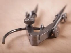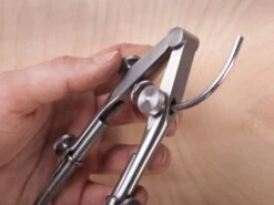 The 85A can span 12″, though the legs can be adjusted for an appropriate reach, and either leg can be replaced with a pencil for use as a compass. The hardened points have a slight offset, so the tips will touch when fully closed for a zero measurement. The knob on the right arm is quick adjustment – unlock and slide along the wing – while the left-leg knob is micro adjustment with spring locking. In spite of its hardy construction, the 85A is surprisingly lightweight and handles deftly.